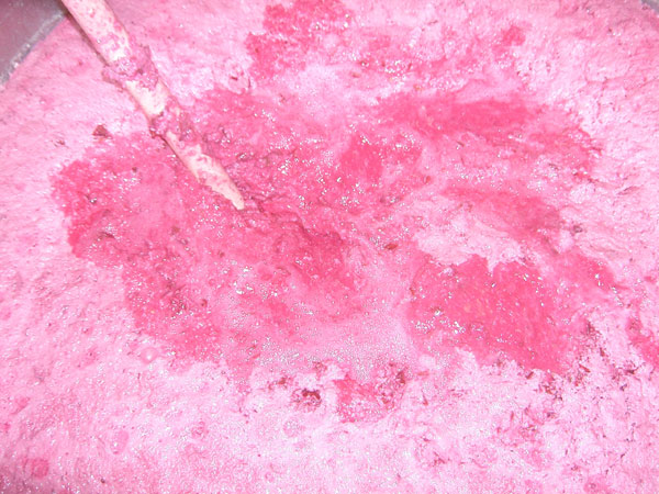もろみ2日目、元気に醗酵しています。すごい色です!まさにショッキングピンク!!こんなもろみ初めて見ました。でも香りは特徴があります。「きびみどり」とは明らかに違う、フルーツ系の香り(ぶどう系?)がします。